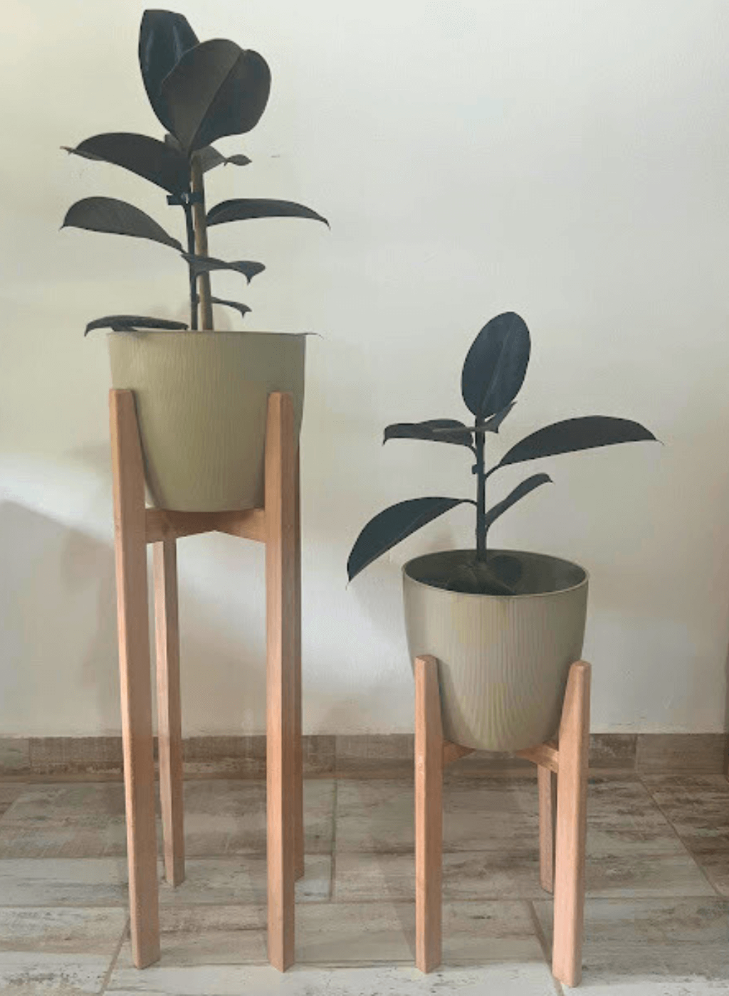 Sus líneas simples y su combinación de texturas —madera natural y maceta en tono suave— aportan equilibrio, calidez y diseño. Perfectas para destacar tus plantas favoritas en interiores o galerías, creando una composición verde que se integra con sutileza al ambiente.