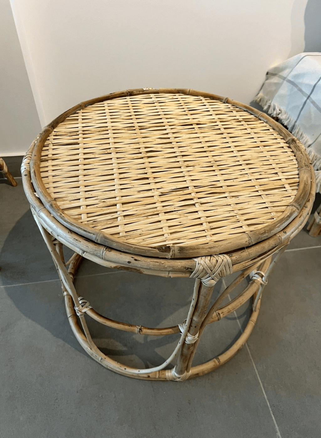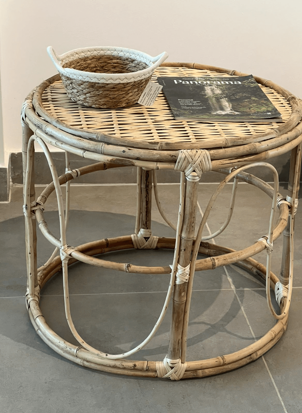 Mesa ratona circular, realizada en caña, con terminaciones curvas.